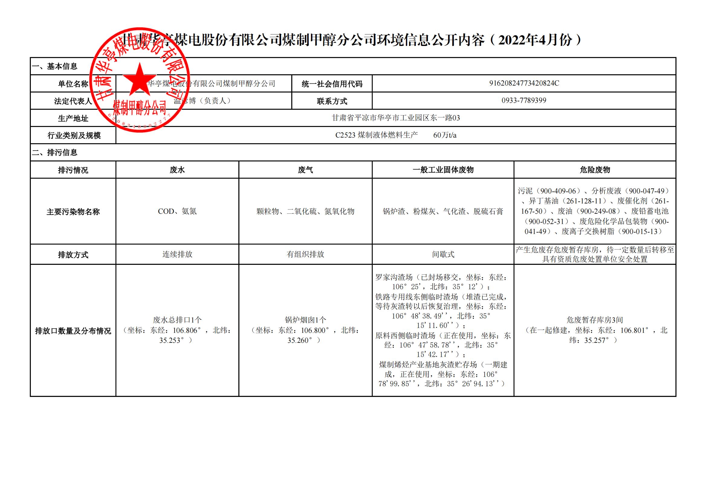 煤制甲醇分公司環(huán)境信息公開內(nèi)容(2022年4月)